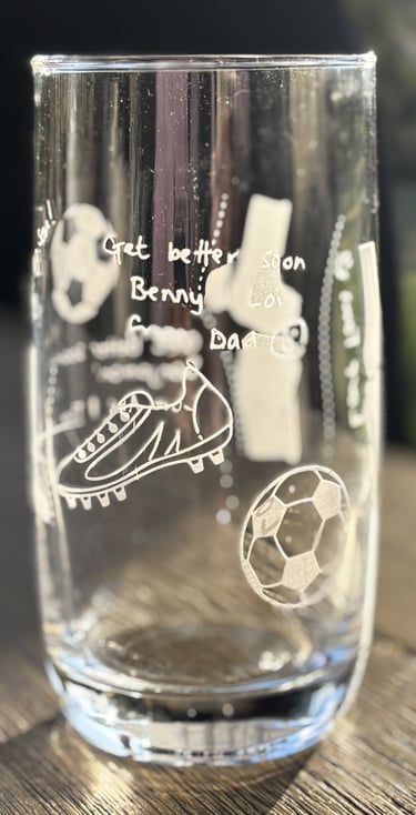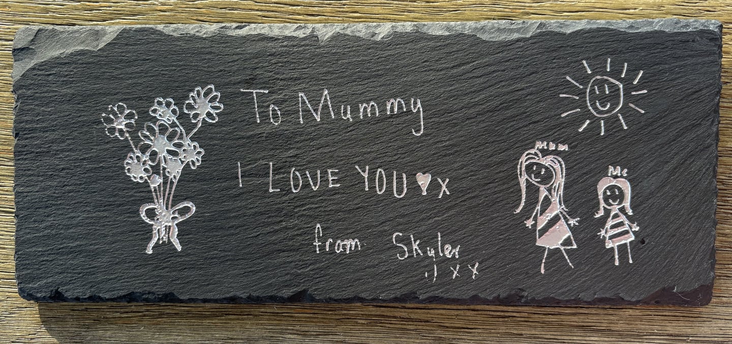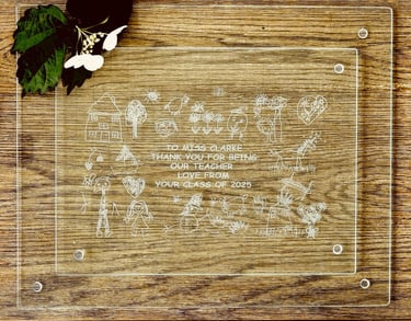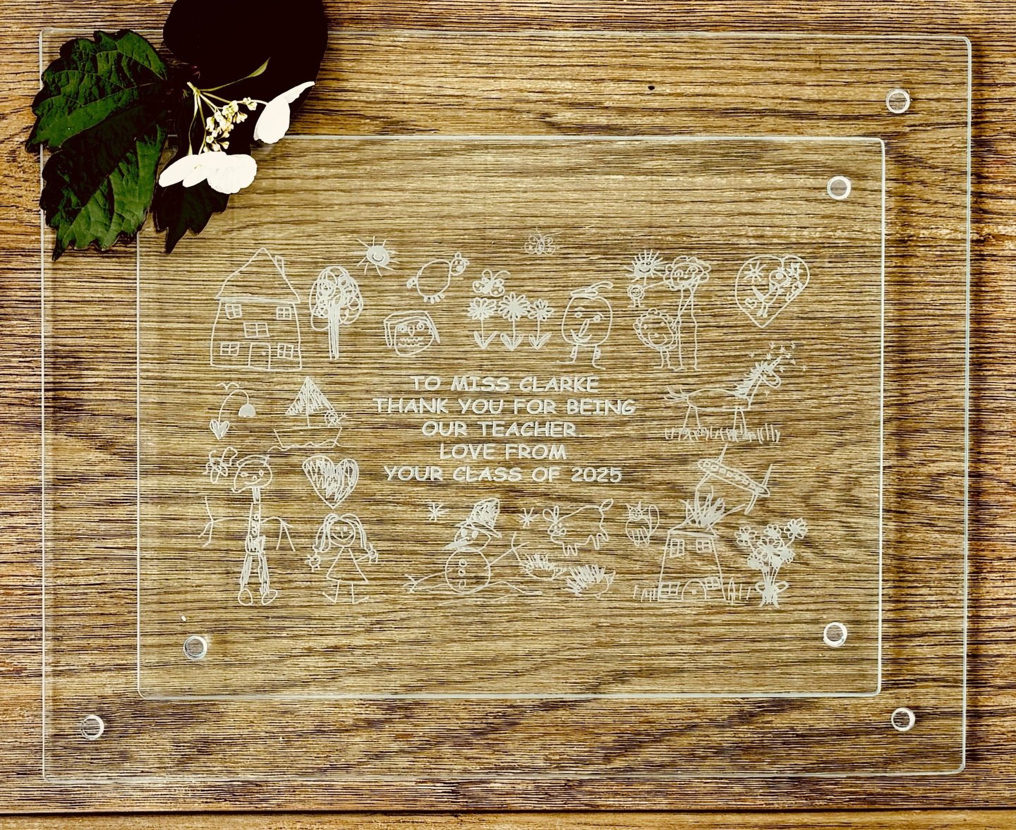 Not sure what to buy for your child's teacher? We can engrave childrens' simple drawings onto a glass chopping board with a class message. Extremely affordable when the class clubs together.