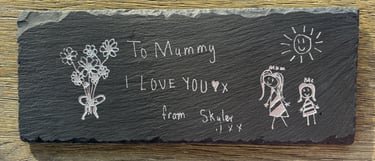 For a limited time, we are providing the opportunity to have your child's artwork engraved onto slate, enhanced with paint. This exquisite keepsake of a moment captured in time is sure to become a cherished treasure forever. 3 sizes available 29cm x 12cm platter, 30cm x 20cm placemat, 10cm x 10cm coaster. Contact Studio Clinq for further information. sandra@studioclinq.com.au