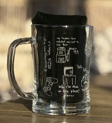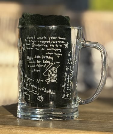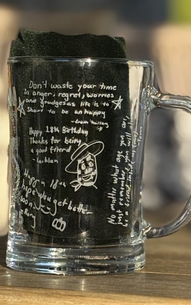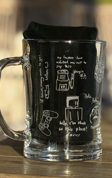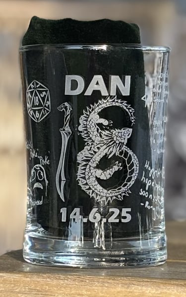 In the example below, Studio Clinq designed the number 18, adhering to the theme of Dungeons and Dragons. Friends contributed their messages, which were then compiled, applied, and etched onto the tankard.