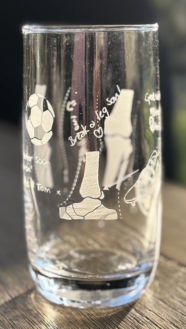 In this case, the individual sustained a broken leg during a soccer game. Studio Clinq copied the X-rays, illustrated the fracture, how and where it was sustained and shared uplifting messages from the gift-givers.