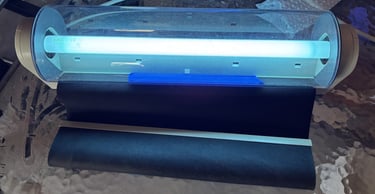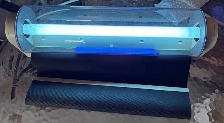 The printed inkjet sheet is applied to a specialised masking sheet and exposed in a light unit for 20 seconds. Any more than that can overexpose the masking sheet and ruin your work and waste the mask. The black ink absorbs the light and makes the mask brittle in the black areas. The inkjet film is now put away. The masking sheet is made up of three layers, a clear slip sheet, a blue masking sheet and a thin clear membrane. The image is not yet visible. Keeping it protected from too much light it is taken to the next step.