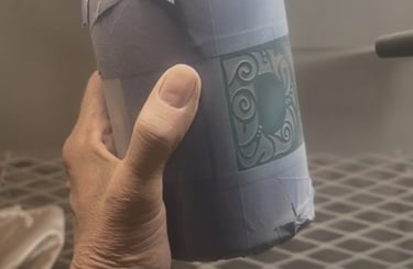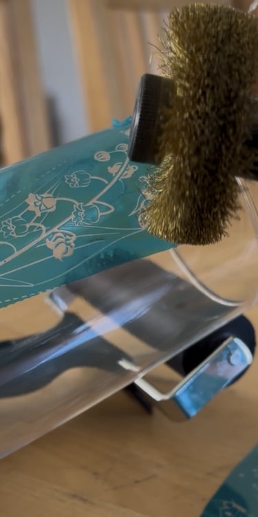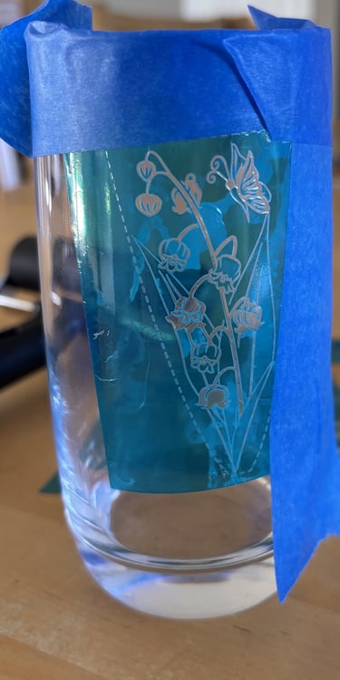 The best part! I utilize my specialized sandblasting machine to engrave the design. The blue mask stays intact while the exposed sections are blasted away. I must take into account the line weights in relation to the depth of the blast and the thickness of the glass. Certain designs and glass pieces may only need a light blast, whereas others might require a more intense and deeper approach.